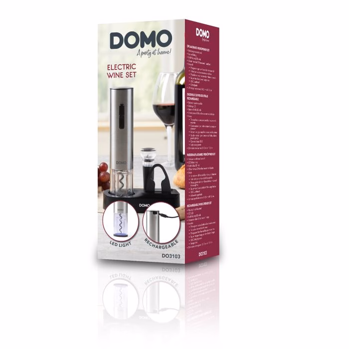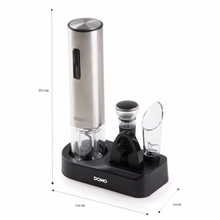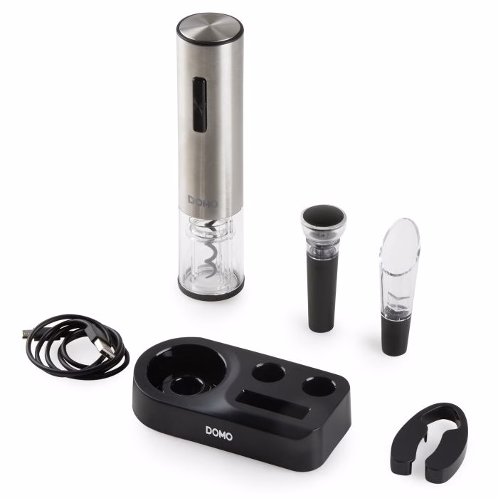 Kas olete veinisõber, kes otsib tõhusat viisi oma lemmikpudelite avamiseks? Siis on DOMO laetav veiniavaja komplekt just see, mida vajate. See võimaldab teil korgi vaevata ja muretult eemaldada 6 sekundi jooksul. Roostevabast terasest korpus ja stiilne LED-valgusti annavad veiniavajale luksusliku välimuse. See komplekt sisaldab kõike, mida vajate oma veini optimaalseks nautimiseks. Fooliumilõikur eemaldab fooliumi kaelalt hõlpsalt. Veinivalaja täiustab maitseid ja aroome. Vaakumkork hoiab teie veini kauem värskena. Kõiki neid tarvikuid saab korralikult kaasasolevas hoiualuses hoiustada. DOMO veiniavaja komplektiga on kaasas USB-C laadimiskaabel.
