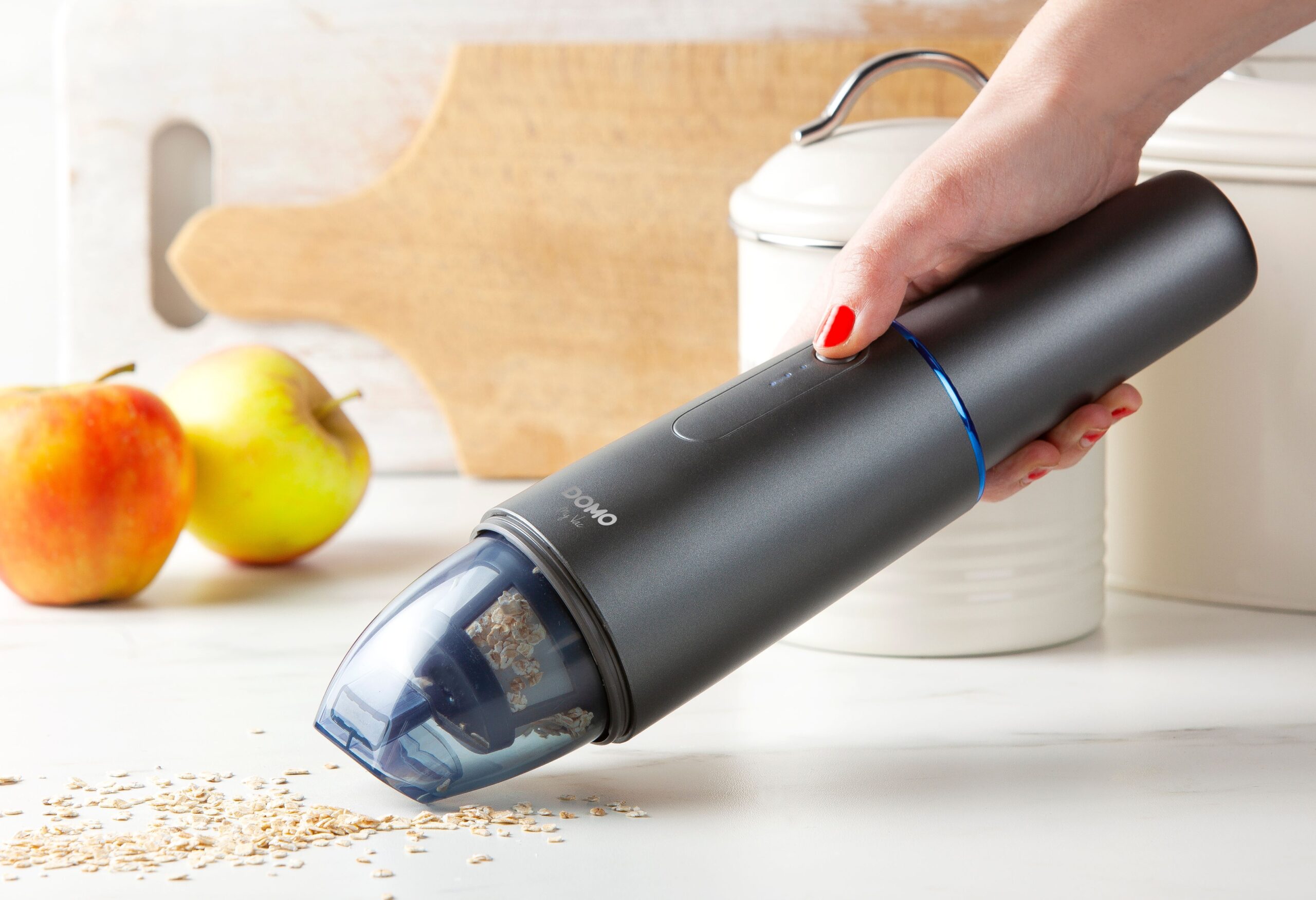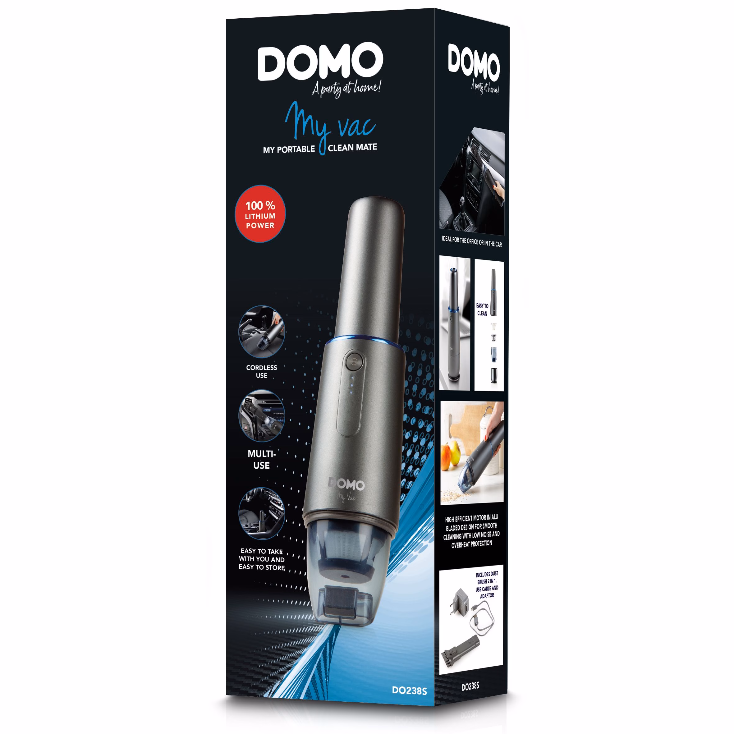 Ideaalne kontorisse või autosse. Lihtne kaasa võtta ja lihtne hoiustada. 7,2 V Li-Ion aku. Juhtmeta kasutamine. Laadimisaeg: 2,5 tundi – autonoomne kasutusaeg: +/- 12 min.. Läbipaistev tolmupaak: 0,1 l. HEPA H10 filtreerimissüsteem. Eemaldatavad filtrid lihtsaks puhastamiseks. Kaasas tolmuhari 2 in 1, USB kaabel ja adapter