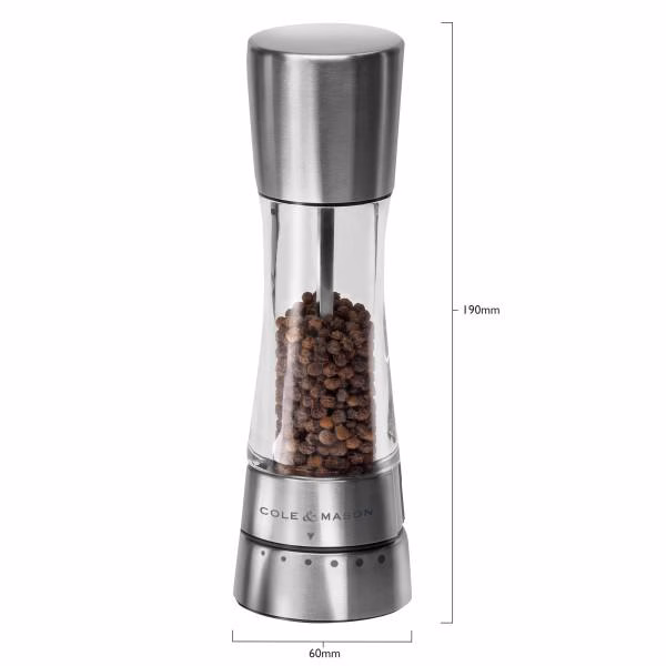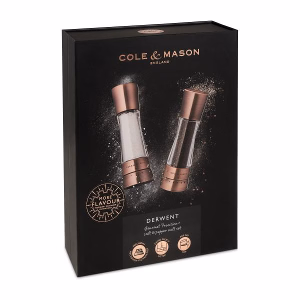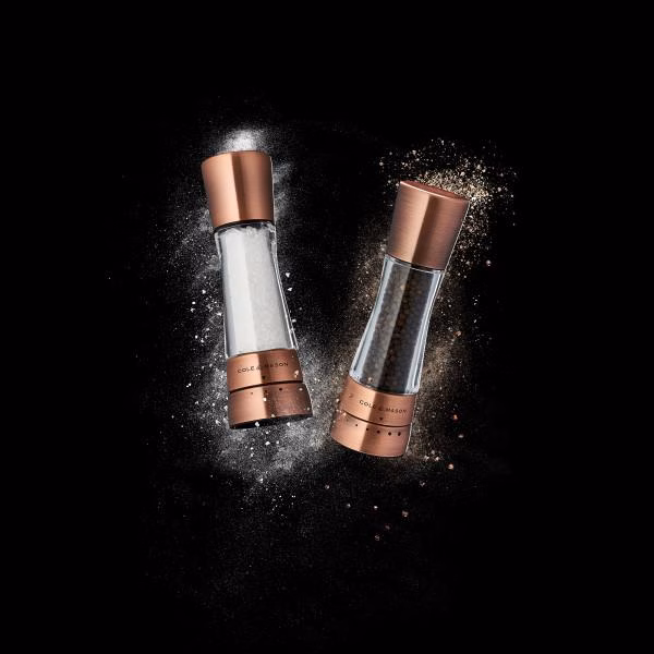 Stiilsed pipra- ja soolaveskid, mis on valmistatud vastupidavast akrüülist ja roostevabast terasest. Soolaveskil 3 ettemääratud jahvatuse taset. Pipraveskil 6 ettemääratud jahvatuse taset. Lihtsaks täitmiseks avage ülemine kork. Soolaveskil on keraamiline veski mehhanism. Pipraveskil on karastatud süsinikterasest veski mehhanism. Veskid on kinkekarbis. Mõõdud: kõrgus 190 mm, läbimõõt 60 mm. Värv: vask